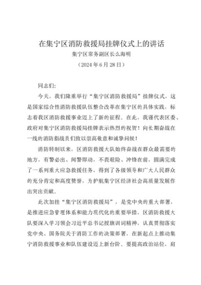 / 领导讲话:20240628在集宁区消防救援局挂牌仪式上的讲话——集宁区常务副区长么海明