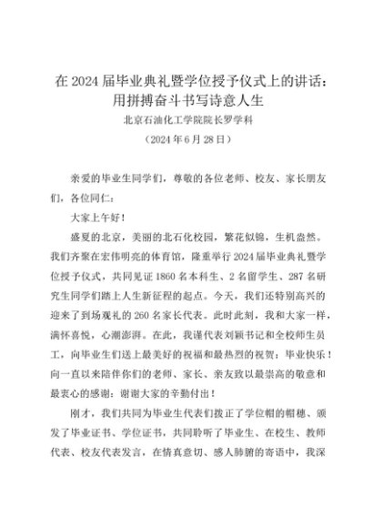 领导讲话:20240628在2024届毕业典礼暨学位授予仪式上的讲话:用拼搏奋斗书写诗意人生——北京石油化工学院院长罗学科