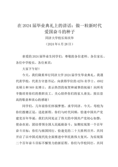 / 领导讲话:20240628在2024届毕业典礼上的讲话:做一粒新时代爱国奋斗的种子——同济大学校长郑庆华