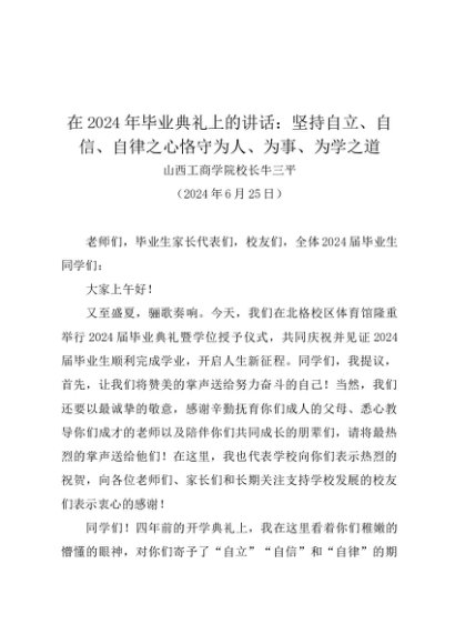 领导讲话:20240625在2024年毕业典礼上的讲话:坚持自立、自信、自律之心恪守为人、为事、为学之道——山西工商学院校长牛三平