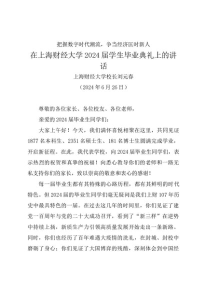 领导讲话:20240626在上海财经大学2024届学生毕业典礼上的讲话——上海财经大学校长刘元春