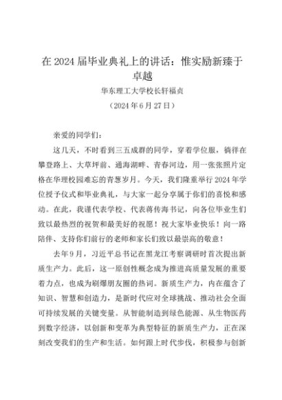/ 领导讲话:20240627在2024届毕业典礼上的讲话:惟实励新臻于卓越——华东理工大学校长轩福贞