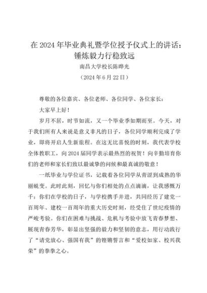 领导讲话:20240622在2024年毕业典礼暨学位授予仪式上的讲话:锤炼毅力行稳致远——南昌大学校长陈晔光