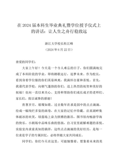 / 领导讲话:20240622在2024届本科生毕业典礼暨学位授予仪式上的讲话:让人生之舟行稳致远——浙江大学校长杜江峰