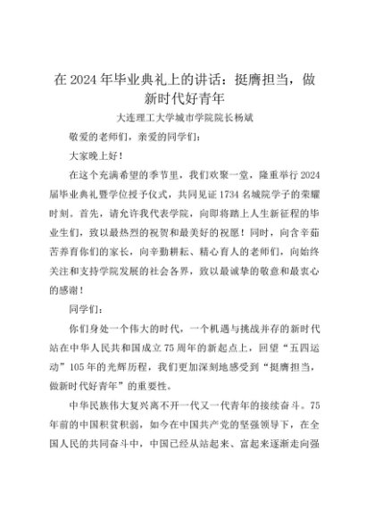 / 领导讲话:20240621在2024年毕业典礼上的讲话:挺膺担当,做新时代好青年——大连理工大学城市学院院长杨斌