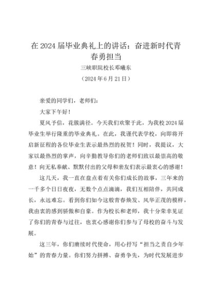 / 领导讲话:20240621在2024届毕业典礼上的讲话:奋进新时代青春勇担当——三峡职院校长邓曦东