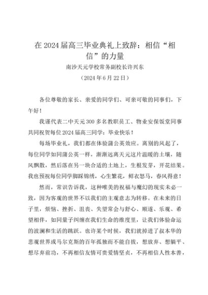 / 领导讲话:20240622在2024届高三毕业典礼上致辞:相信“相信”的力量——南沙天元学校常务副校长许兴东