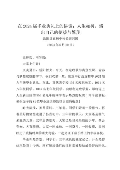 领导讲话:20240620在2024届毕业典礼上的讲话:人生如树,活出自己的挺拔与繁茂——汝阳县直初中校长姬兴国