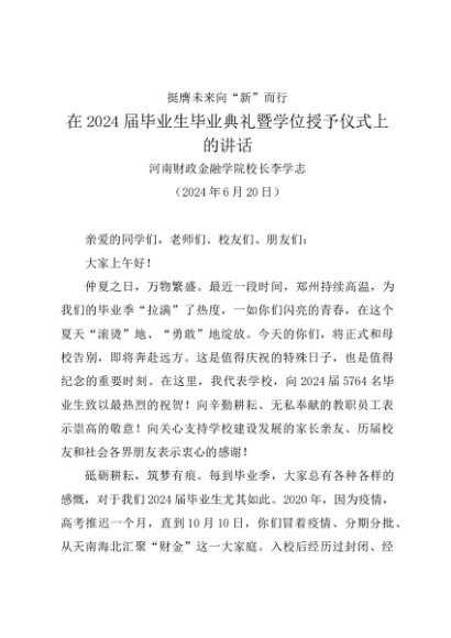 / 领导讲话:20240620在2024届毕业生毕业典礼暨学位授予仪式上的讲话——河南财政金融学院校长李学志