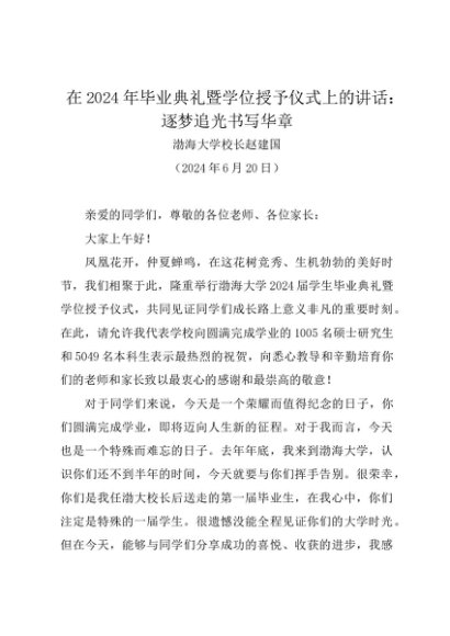 领导讲话:20240620在2024年毕业典礼暨学位授予仪式上的讲话:逐梦追光书写华章——渤海大学校长赵建国