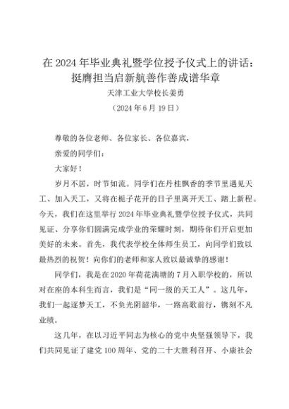 领导讲话:20240619在2024年毕业典礼暨学位授予仪式上的讲话:挺膺担当启新航善作善成谱华章——天津工业大学校长姜勇