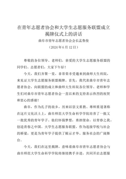 / 领导讲话:20240612在青年志愿者协会和大学生志愿服务联盟成立揭牌仪式上的讲话——曲阜市青年志愿者协会会长孟鲁俊
