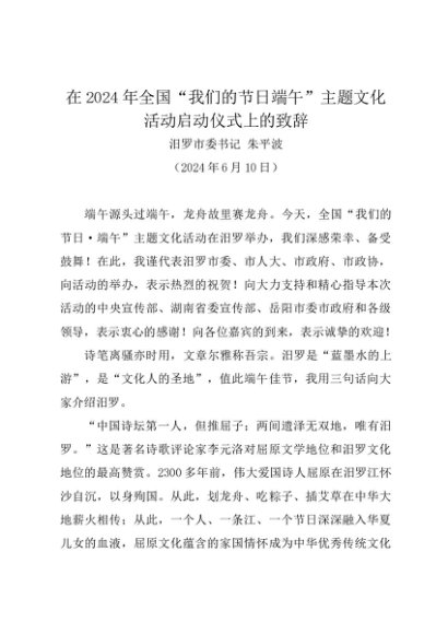 / 领导讲话:20240610在2024年全国“我们的节日端午”主题文化活动启动仪式上的致辞——汨罗市委书记