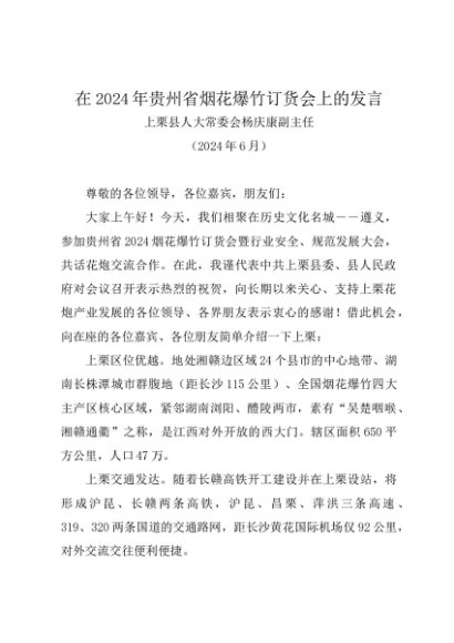 / 领导讲话:20240607在2024年贵州省烟花爆竹订货会上的发言——上栗县人大常委会杨庆康副主任