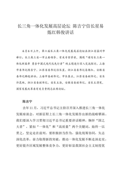 / 领导讲话:20240606长三角一体化发展高层论坛 陈吉宁信长星易炼红韩俊讲话