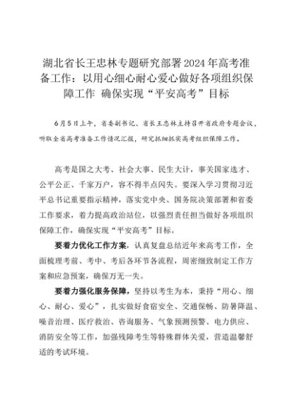 领导讲话:20240605湖北省长王忠林专题研究部署2024年高考准备工作:以用心细心耐心爱心做好各项组织保障工作 确保实现“平安高考”目标