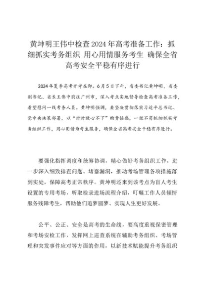 领导讲话:20240605黄坤明王伟中检查2024年高考准备工作:抓细抓实考务组织 用心用情服务考生 确保全省高考安全平稳有序进行