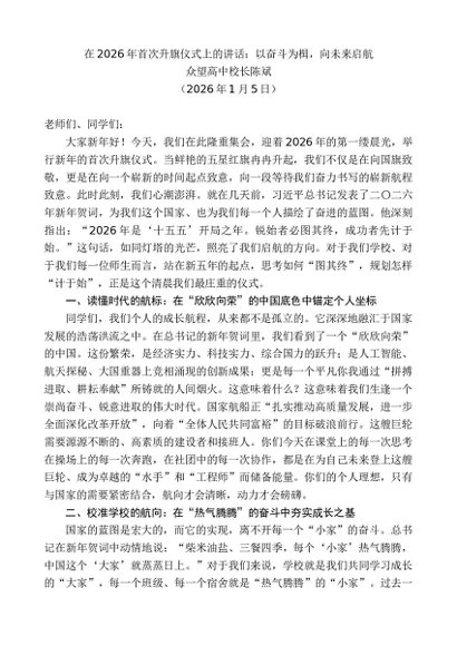 领导讲话:20260115众望高中校长陈斌:在2026年首次升旗仪式上的讲话:以奋斗为楫,向未来启航