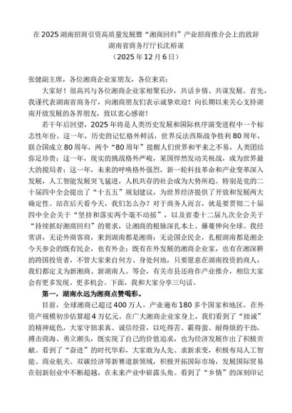 / 领导讲话:20260115湖南省商务厅厅长沈裕谋:在2025湖南招商引资高质量发展暨“湘商回归”产业招商推介会上的致辞