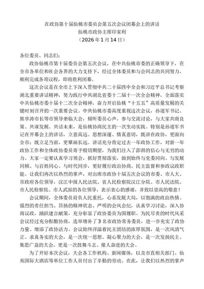 / 领导讲话:20260115仙桃市政协主席印家利:在政协第十届仙桃市委员会第五次会议闭幕会上的讲话