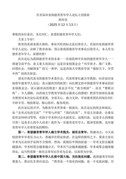 / 领导讲话:20251230杜时忠:在首届田家炳德育青年学人论坛上的致辞