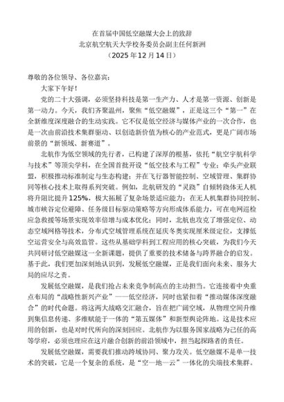 / 领导讲话:20260115北京航空航天大学校务委员会副主任何新洲:在首届中国低空融媒大会上的致辞