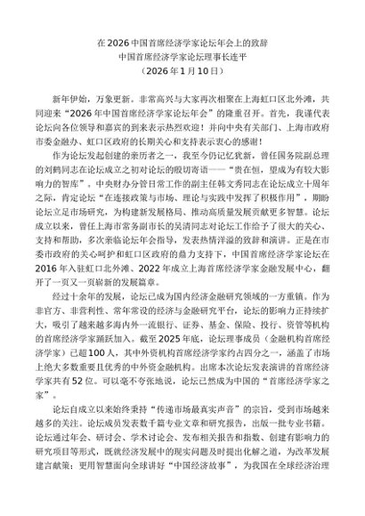 领导讲话:20260115中国首席经济学家论坛理事长连平:在2026中国首席经济学家论坛年会上的致辞