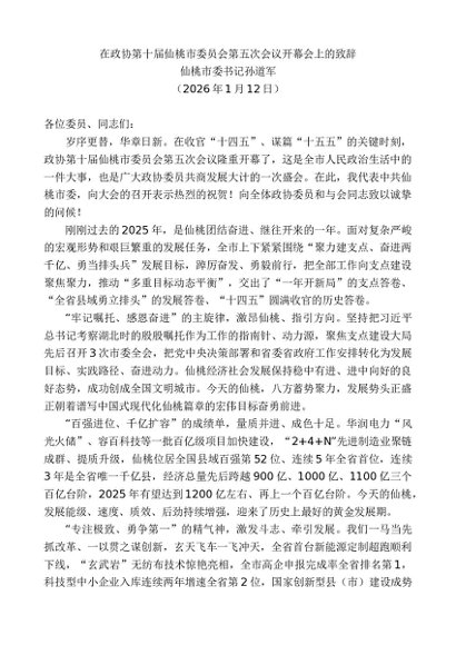 / 领导讲话:20260115仙桃市委书记孙道军:在政协第十届仙桃市委员会第五次会议开幕会上的致辞