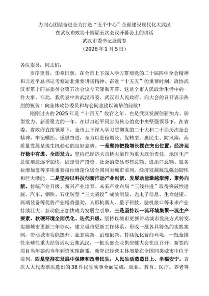 / 领导讲话:20260115武汉市委书记盛阅春:在武汉市政协十四届五次会议开幕会上的讲话