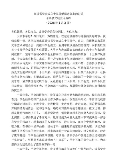 / 领导讲话:20260115永嘉县文联主席易峰:在读书学会成立十五周年纪念会上的讲话