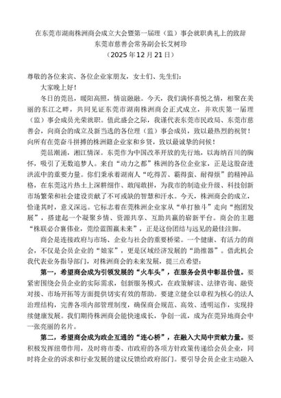 / 领导讲话:20260115艾树珍:在东莞市湖南株洲商会成立大会暨第一届理(监)事会就职典礼上的致辞