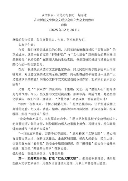 / 领导讲话:20260115在双桥区义警协会文联分会成立大会上的致辞:以文润安,让笔力与脚力一起巡逻