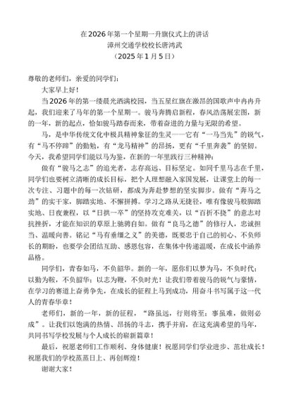 / 领导讲话:20260115漳州交通学校校长唐鸿武:在2026年第一个星期一升旗仪式上的讲话