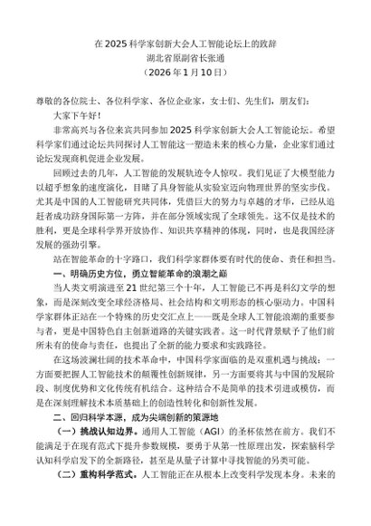 / 领导讲话:20260115湖北省原副省长张通:在2025科学家创新大会人工智能论坛上的致辞