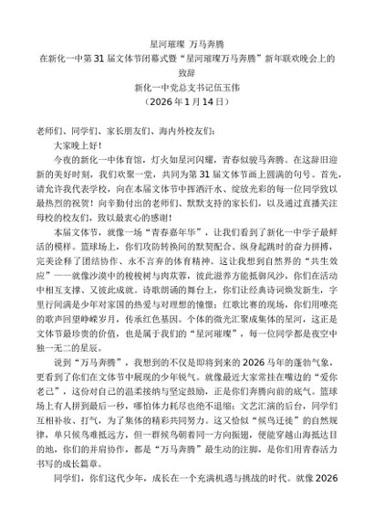 / 领导讲话:20260115在新化一中第31届文体节闭幕式暨“星河璀璨万马奔腾”新年联欢晚会上的致辞