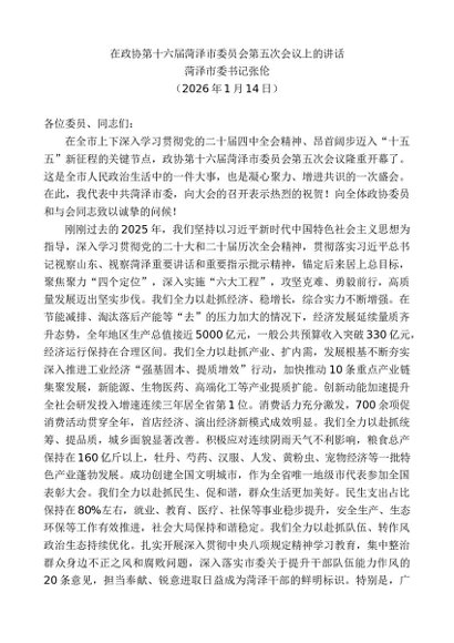 领导讲话:20260115菏泽市委书记张伦:在政协第十六届菏泽市委员会第五次会议上的讲话