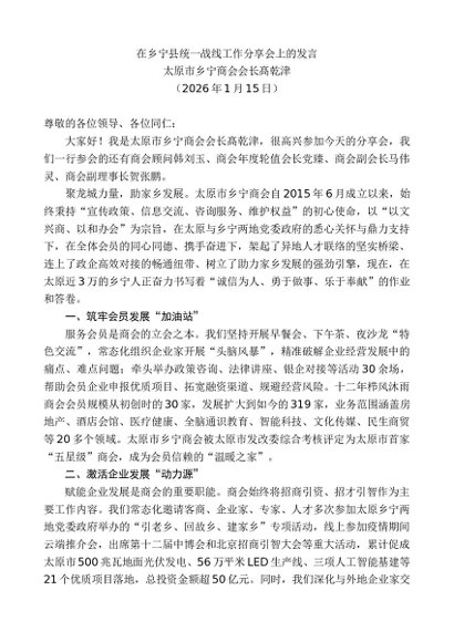 / 领导讲话:20260115太原市乡宁商会会长髙乾津:在乡宁县统一战线工作分享会上的发言
