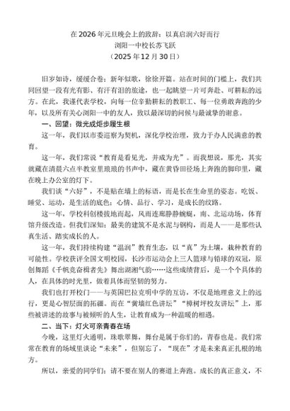 / 领导讲话:20251230浏阳一中校长苏飞跃:在2026年元旦晚会上的致辞:以真启润六好而行