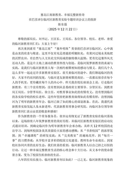 领导讲话:20251230在巴彦淖尔临河区新教育实验专题培训会议上的致辞:塞北江南新教育,幸福完整新传奇