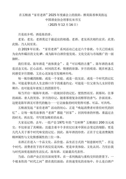 / 领导讲话:20251230中国酒业协会理事长宋书玉:在五粮液“家有老酒”2025年度盛会上的致辞:醉美陈香和美致远
