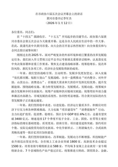 / 领导讲话:20260115黄冈市委书记李军杰:在市政协六届五次会议开幕会上的讲话