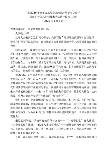 / 领导讲话:20260115苏州托普信息职业技术学院执行校长王晓怡:在2026年新年文艺晚会上的致辞筑梦向心而行