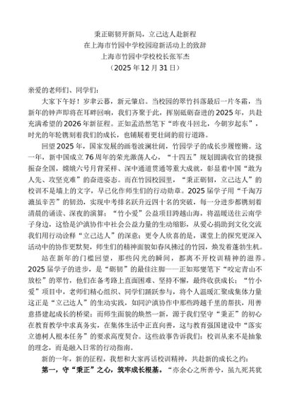 / 领导讲话:20251230在上海市竹园中学校园迎新活动上的致辞:秉正砺韧开新局,立己达人赴新程