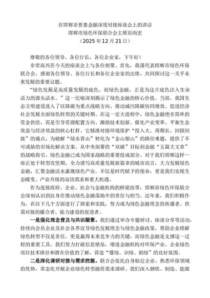 / 领导讲话:20251230邯郸市绿色环保联合会主席田尚宏:在邯郸市普惠金融深度对接座谈会上的讲话