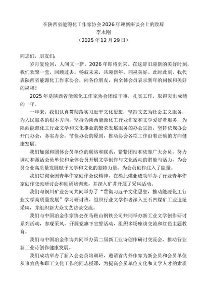领导讲话:20251230李永刚:在陕西省能源化工作家协会2026年迎新座谈会上的致辞