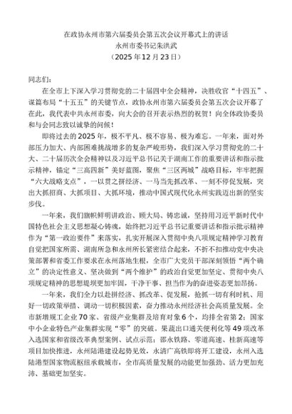 / 领导讲话:20251230永州市委书记朱洪武:在政协永州市第六届委员会第五次会议开幕式上的讲话