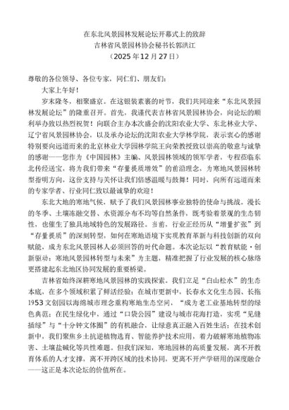 / 领导讲话:20260115吉林省风景园林协会秘书长郭洪江:在东北风景园林发展论坛开幕式上的致辞