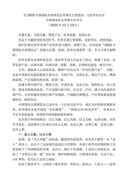 / 领导讲话:20251230中国酒业协会理事长宋书玉:在2025中国国际名酒博览会开幕式上的致辞:与世界共宜宾