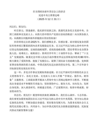 / 领导讲话:20251230民进中央主席蔡达峰:在全国政协新年茶话会上的讲话