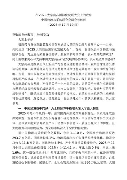 / 领导讲话:20251230中国物流与采购联合会副会长何辉:在2025大宗商品国际化发展大会上的致辞